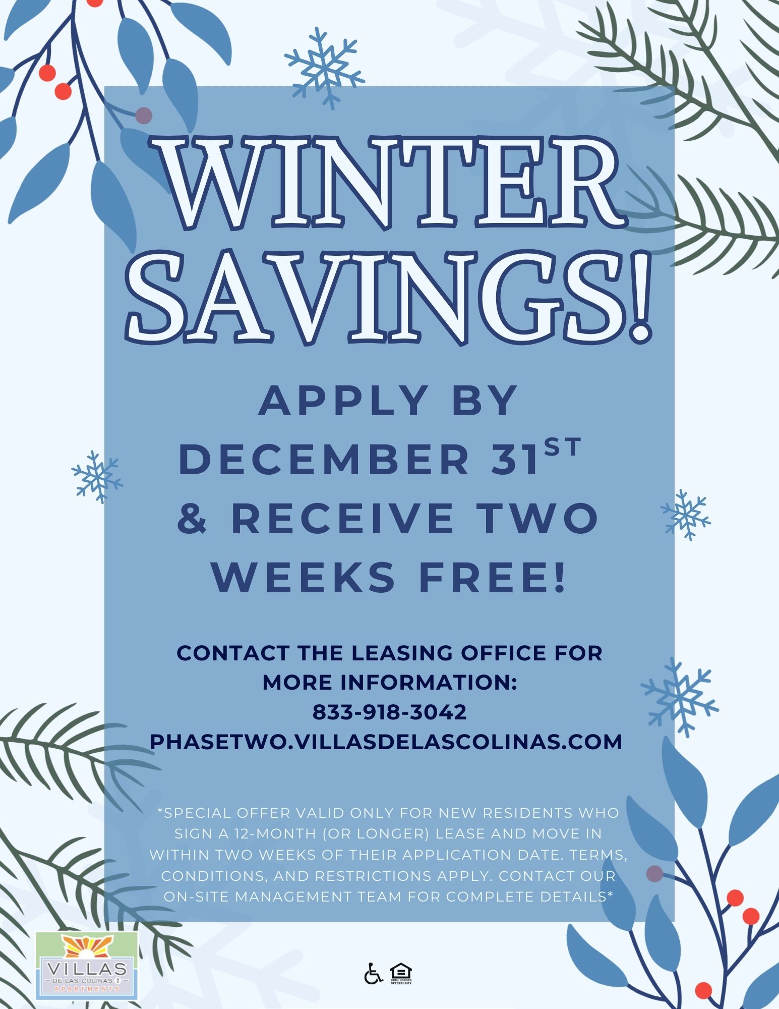 Apply by December 31st & receive two weeks free on 12+ month leases! Contact the Leasing Office for more information!⤵️ ¡Solicita antes del 31 de diciembre y recibe dos semanas gratis en contratos de arrendamiento de más de 12 meses! ¡Contacta con la oficina de arrendamiento para más información!⤵️